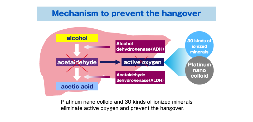 Platinum nano colloid and ionized minerals remove active oxygen that causes hangover Alcohol in the body is degraded by enzymes in the liver.When the degrating process doesn't catch up, hazardous acetaldehyde will be generated.It also produces large amounts of active oxygen and causes hangover symptoms such as headaches and nausea. Mechanism to prevent the hangover We can't really expect the active oxygen removal effect for the other hangover products. For example,Turmeric (curcumin) Hepalese Vitamin B amino acid Ornithine These are effective for decomposition of alcohol but not for  removing active oxygen. The platinum nanocolloid eliminates active oxygen itself.With the well  balanced ingredient combination, it eliminates the root causes of hangover. Minerals are essential for our daily health Relationship between drinking and mineral