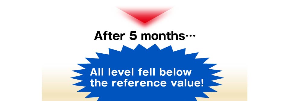 One test subject who has high level of AST (GOT) and ALT (GPT) , which indicates impaired hepatocytes, keeps drinking Awakening of Platinum. After 5 months…All level fell below the reference value! It's effective for diet!